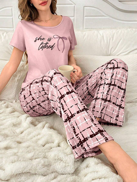 سعر البيع LE 1,115.00 EGP السعر العادي LE 1,595.00سعر الوحدة /غير متاحShein - 2pcs Set Letter & Bow Print Short Sleeve Sleepwear And Plaid Lounge Pants Bowknot