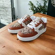 زوج أنيق من الأحذية الرياضية منخفضة الرقبة مع لمسات شعار منقوش على الألواح الجانبية، وتصميم من الجلد الصناعي، وربطة عنق.