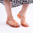 This footwear features a retro-inspired jelly sandal design with a block heel, offering both style and stability. The open, woven upper provides breathability, while the adjustable strap at the back ensures a secure fit. Made from a glossy, flexible material, it's easy to clean and ideal for casual summer wear. Perfect for pairing with dresses, skirts, or cropped pants for a playful yet chic look